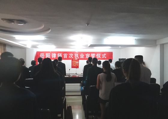 这是我市律师首次执业的宣誓仪式,是执业律师“入行”的第一节课,体现了市律师协会对执业律师构建职业道德、树立执业目标、践行执业理念的重视,在国歌的伴奏中,岳阳市司法局、岳阳市律师协会向36名获许可批准的新执业律师颁发了律师执业证书。