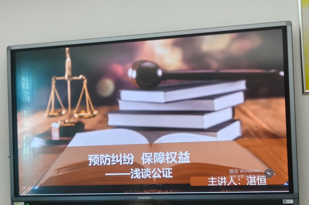 公证员李倩云就公证业务的申请受理、审查核实、出证送达等环节进行了专业讲解,演练了办理委托公证的流程。随后,湘北公证处副主任湛恒开展公证知识讲座,通过图文并茂的方式介绍了公证的法律效力、业务范围以及在保障权益、预防纠纷中的重要作用,并详细说明了湘北公证处为军人军属、老年人、残障人士等群体提供的便民服务措施。