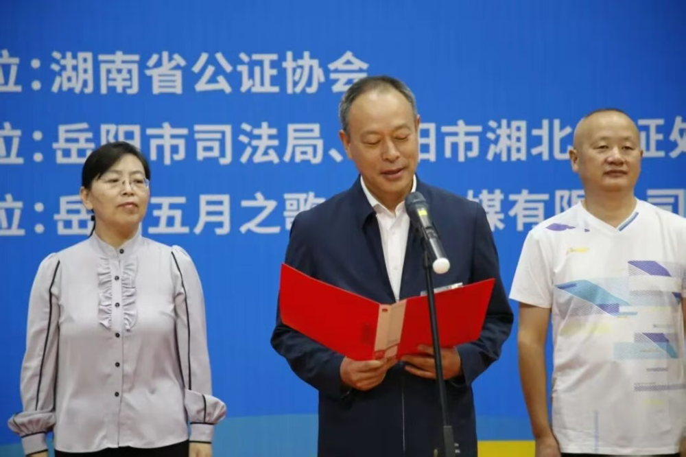 湖南省司法厅二级巡视员陈少杰,厅公共法律服务管理处处长周桥,岳阳市司法局党组书记、局长李峰,厅公共法律服务管理处副处长蒋泞鸿,省公证协会秘书长蔡灿、会长刘策良、副会长高业庆、呼延晓红、祖千里、陈婷、监事吴永萍、岳阳市司法局三级调研员陈海强出席开幕式,省司法厅公共法律服务管理处和全省14个市州共200余名参赛运动员参加开幕式。