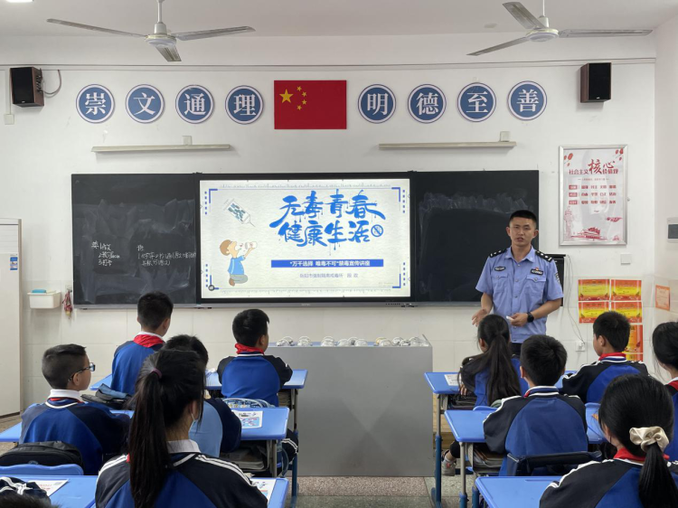 “毒品不单只是常见的那几种,现在出现了许多伪装成饮料和零食的新型精神活性物质,同学们一定要擦亮双眼,提高防范意识。”“在我们戒毒所的戒毒人员中,最早的从13岁就开始接触毒品了,所以毒品其实离我们并不遥远,它就潜伏在我们的身边。”戒毒所团委书记段政结合自身的工作经验,给六年级1501班的同学们上了一堂生动的禁毒宣传教育课。他为同学们进行了禁毒知识讲解、模拟毒品的展示与介绍,还在课后为全班同学颁发了《禁毒宣传小卫士聘书》,并给他们布置了向家人宣讲禁毒知识的课后作业。同学们纷纷表示一定远离毒品,当好禁毒宣传小卫士。