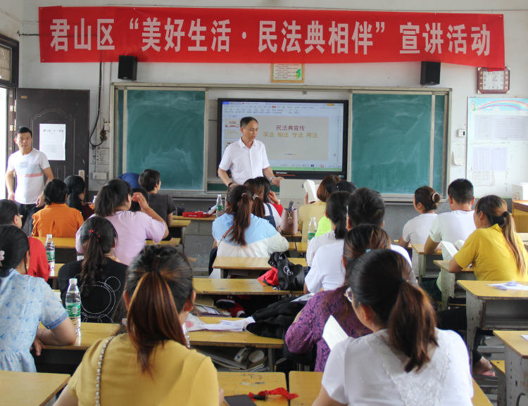 6月2日,在君山区良心堡镇七星湖小学,君山区司法局采取“律师+讲座+互动”的形式,为该校师生及学生家长举办民法典讲座,并慰问20名留守儿童,为他们送去“六一”节礼物。“平时都忙于农活,通过今天的讲课,才知道今年新实施了民法典,但自己没遇到法律问题时总觉得离自己远,用不上,这次司法局组织到学校进行民法典宣传,效果真的非常好”,很多学生家长如是说。这是君山区司法局开展“美好生活·民法典相伴”主题宣传“五进”活动的一个剪影。
