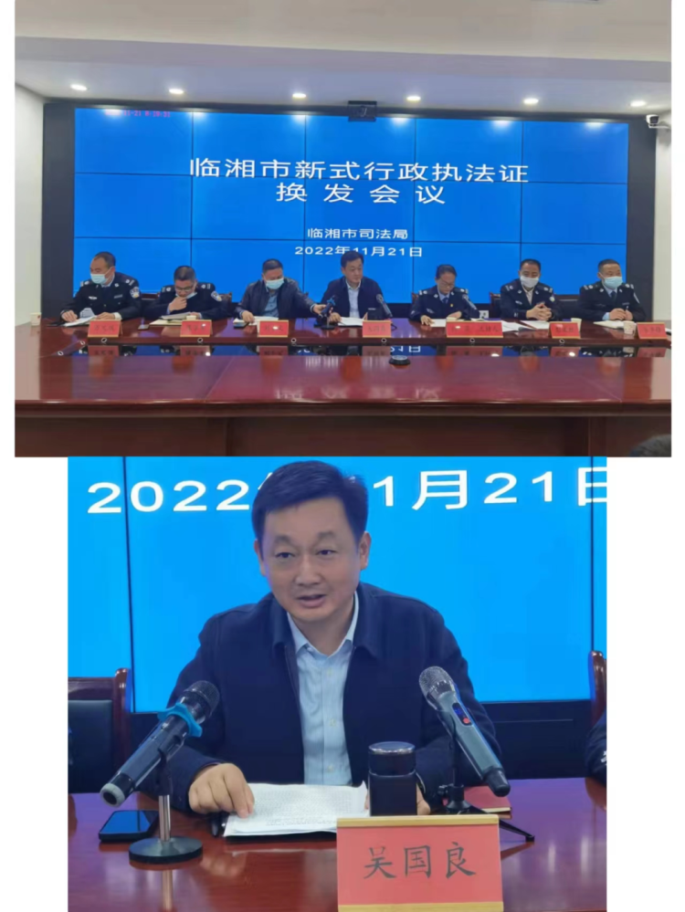 最后,吴国良副市长指出行政执法证件是行政执法人员依法履行职责、实施行政执法活动的身份证明,统一行政执法证件标准样式对于推进全面依法治市、建设法治政府具有重要意义,他要求全市执法机构和执法人员要切实增强行政执法的责任感和使命感,要切实提高依法行政的能力和水平,要切实树立行政执法的良好形象,要切实完善行政执法的监督机制,切实履行好行政执法的责任,为推动临湘高质量发展作出应有的贡献!(临湘市司法局投稿)