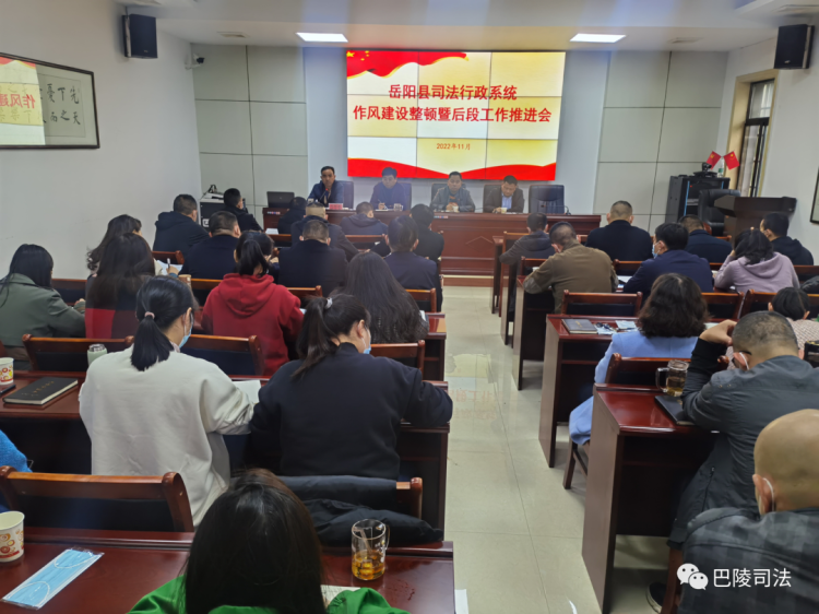 11月22日,岳阳县司法局组织召开司法行政系统工作作风整顿暨党的二十大精神学习培训会,围绕工作作风整顿、社区矫正和司法所规范化建设工作进行安排部署,贯彻学习党的二十大精神。会议由党组副书记、副局长李海波主持,局全体班子成员,各基层司法所所长,收治中心主任、教导员及机关全体干部参加本次会议。