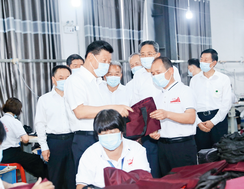 2020年8月18日至21日,中共中央总书记、国家主席、中央军委主席习近平在安徽省考察。这是18日下午,习近平在阜阳市阜南县红亮箱包有限公司察看车间生产线,了解企业灾后恢复生产和受灾群众、贫困群众就业情况。新华社记者 鞠鹏/摄