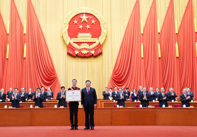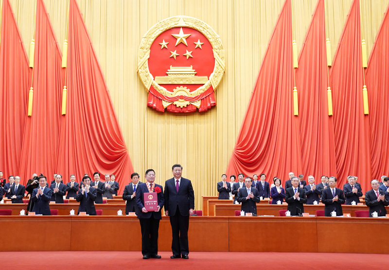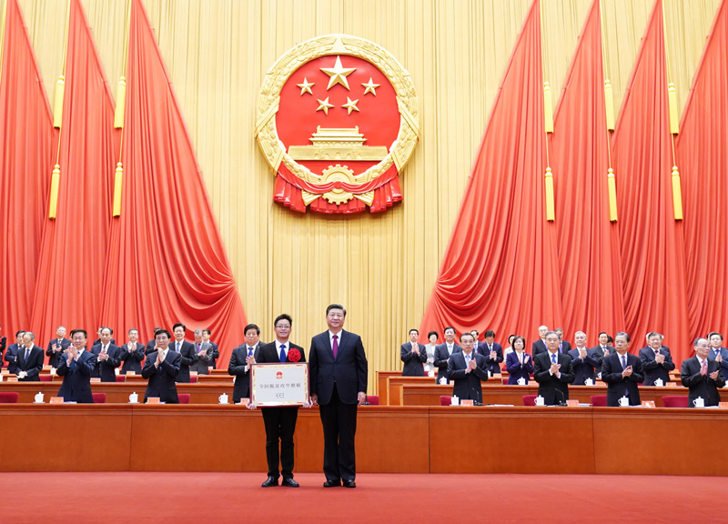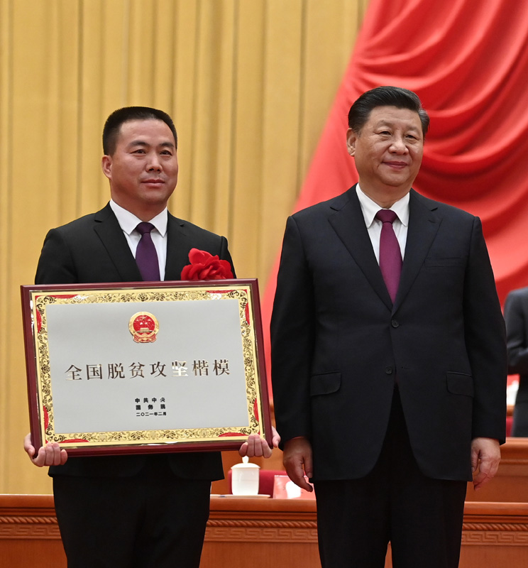 2月25日,全国脱贫攻坚总结表彰大会在北京人民大会堂隆重举行。这是习近平为全国脱贫攻坚楷模荣誉称号获得者青海省海东市互助土族自治县五十镇班彦村颁奖。新华社记者 李学仁 摄