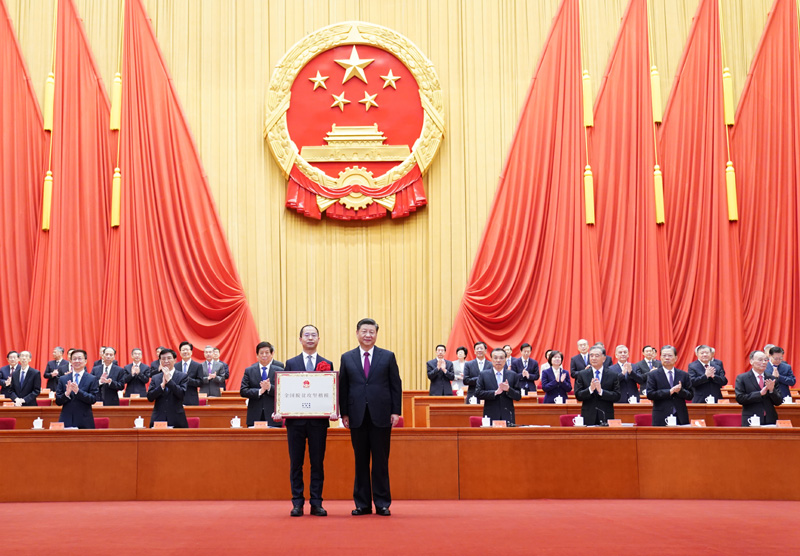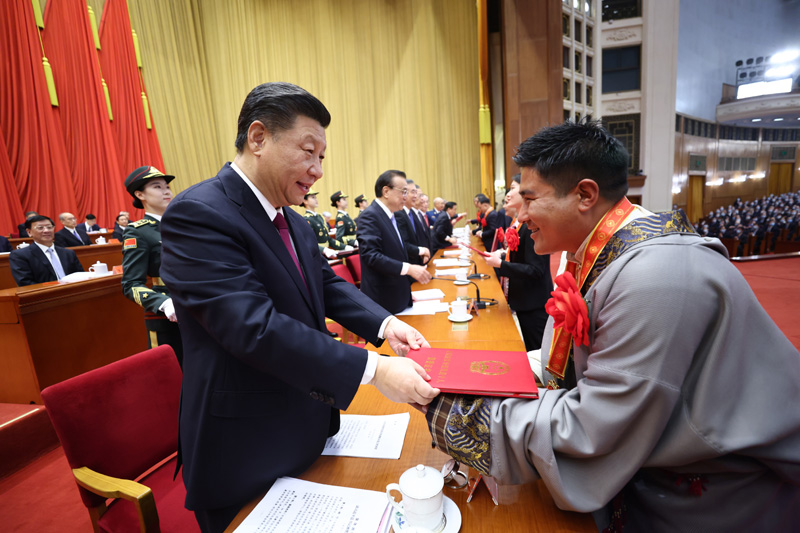 2月25日,全国脱贫攻坚总结表彰大会在北京人民大会堂隆重举行。这是习近平为全国脱贫攻坚楷模荣誉称号获得者国网西藏电力有限公司农电工作部颁奖。新华社记者 燕雁 摄