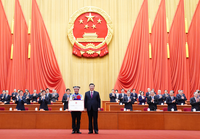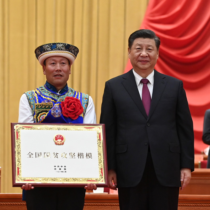 2月25日,全国脱贫攻坚总结表彰大会在北京人民大会堂隆重举行。这是习近平为全国脱贫攻坚楷模荣誉称号获得者四川省凉山彝族自治州昭觉县三岔河镇三河村颁奖。新华社记者 燕雁 摄