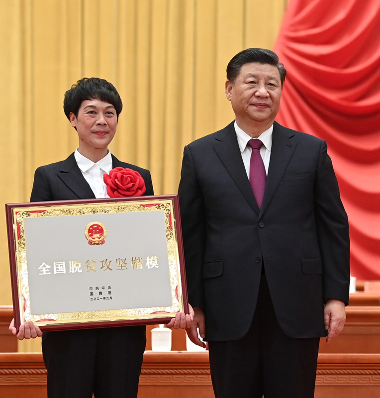 2月25日,全国脱贫攻坚总结表彰大会在北京人民大会堂隆重举行。这是习近平为全国脱贫攻坚楷模荣誉称号获得者四川省凉山彝族自治州昭觉县三岔河镇三河村颁奖。新华社记者 李学仁 摄