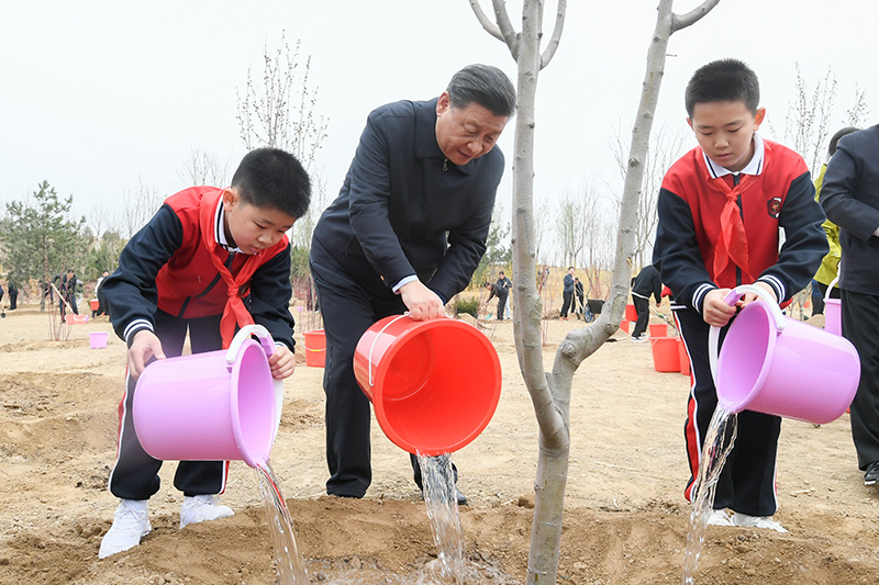 4月2日,党和国家领导人习近平、李克强、栗战书、汪洋、王沪宁、赵乐际、韩正、王岐山等来到北京市朝阳区温榆河参加首都义务植树活动。这是习近平同少先队员一起给刚栽下的树苗浇水。新华社记者 李学仁 摄