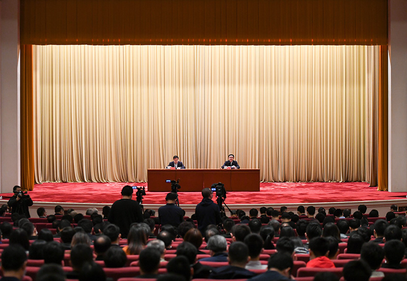 2021年3月16日,党史学习教育中央宣讲团首场报告会在北京举行。这是中央宣讲团成员、中央党史和文献研究院院长曲青山(右)在报告会上作宣讲报告。新华社记者 陈晔华 摄