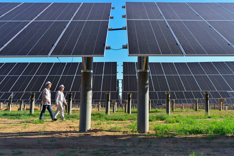 工作人员在内蒙古自治区鄂尔多斯市伊金霍洛旗天骄绿能50万千瓦采煤沉陷区生态治理光伏发电示范项目区里巡查(2021年7月8日摄)。新华社发(王正 摄)