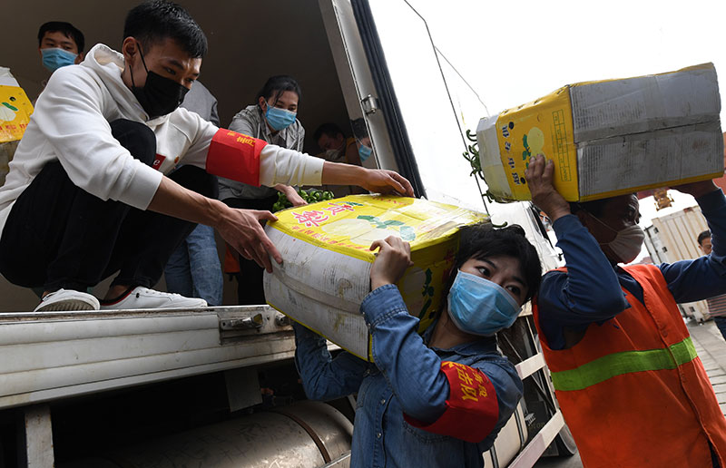 2020年3月3日,在广西南宁国际铁路港,南宁车务段“青年突击队”队员黄莹莹(右二)在搬运广西驰援湖北物资。新华社记者 陆波岸 摄
