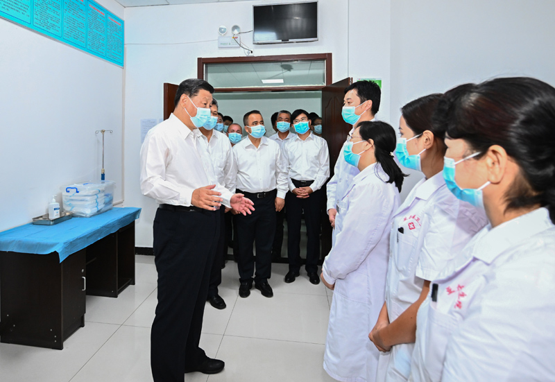 7月12日至15日,中共中央总书记、国家主席、中央军委主席习近平在新疆考察。这是14日,习近平在吐鲁番市高昌区亚尔镇新城片区新城西门村党群服务中心医务室考察。新华社记者 燕雁 摄