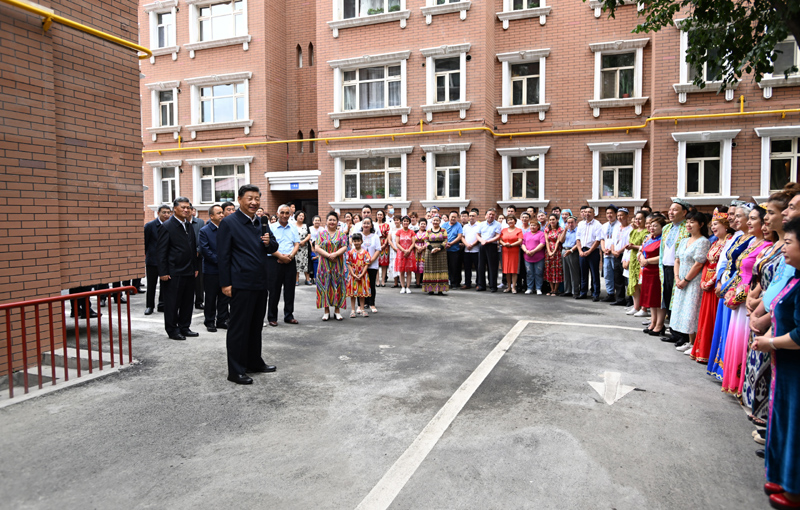 7月12日至15日,中共中央总书记、国家主席、中央军委主席习近平在新疆考察。这是13日上午,习近平在乌鲁木齐市天山区固原巷社区考察时,同各族群众在一起。新华社记者 谢环驰 摄