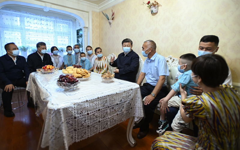 7月12日至15日,中共中央总书记、国家主席、中央军委主席习近平在新疆考察。这是13日上午,习近平在乌鲁木齐市天山区固原巷社区,同维吾尔族居民阿布来提·吐尔逊一家人围坐在一起拉家常。新华社记者 谢环驰 摄