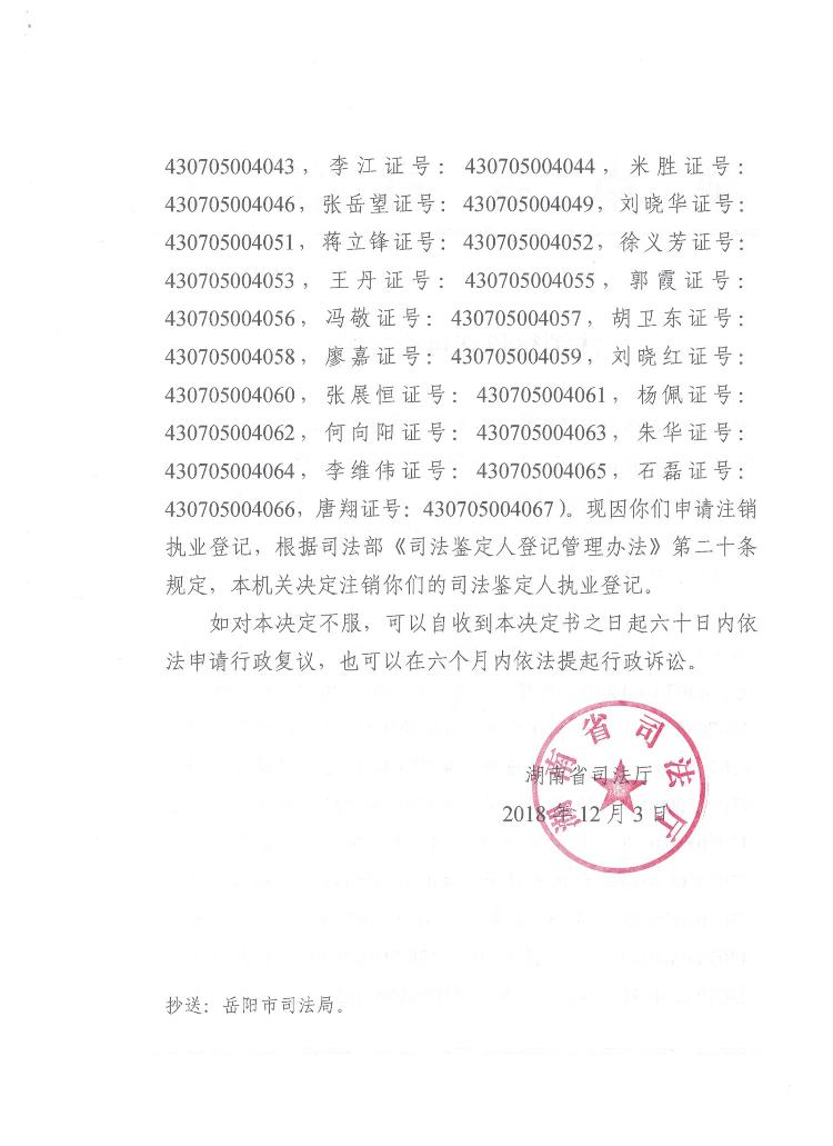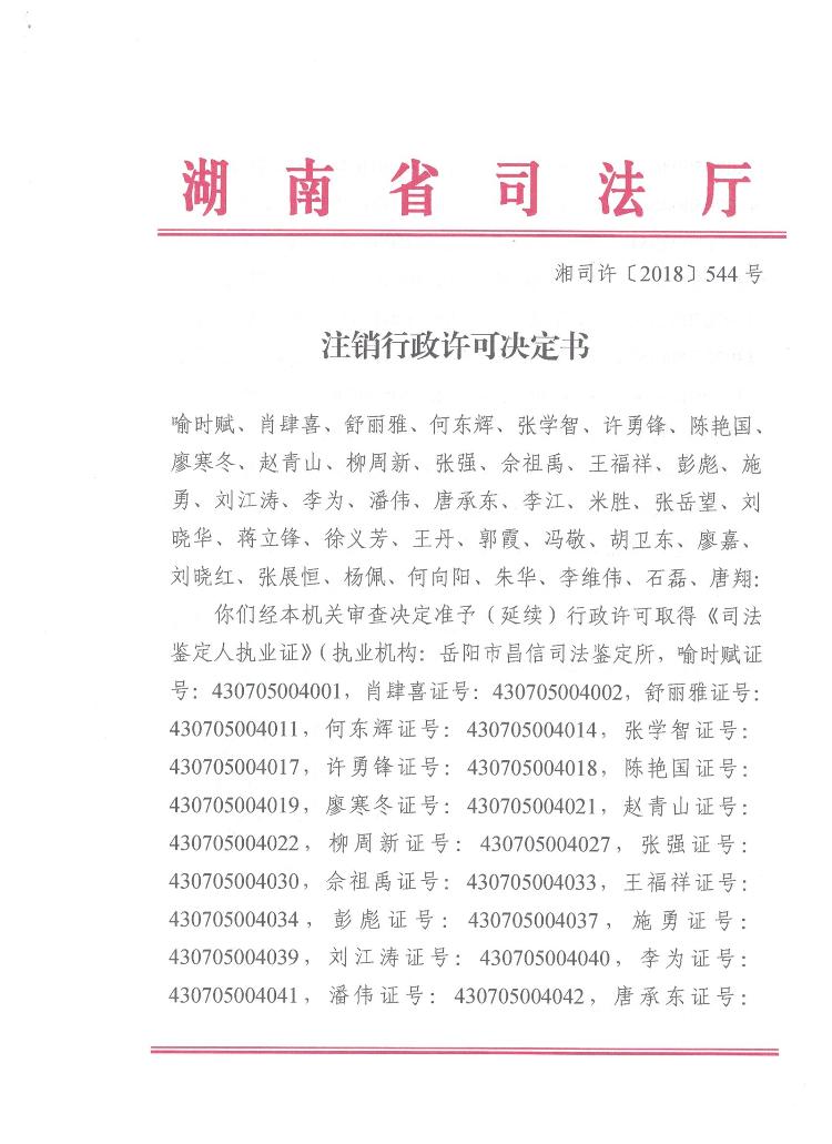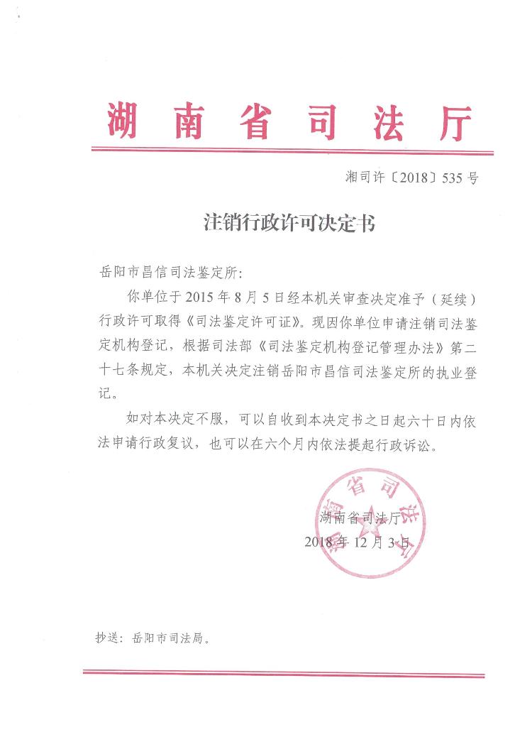 注销行政许可决定书(岳阳市昌信司法鉴定所)