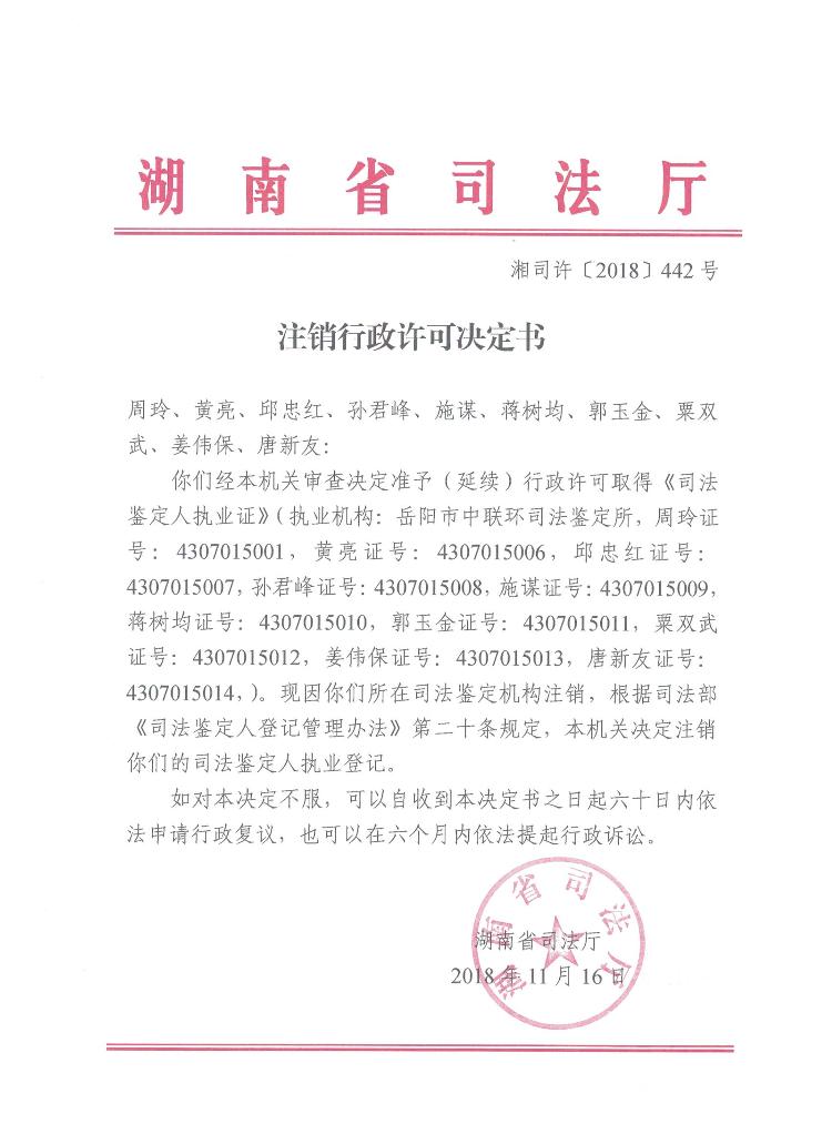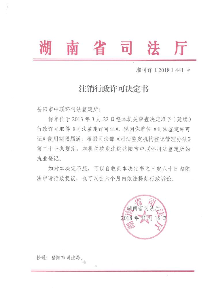 注销行政许可决定书(岳阳市中联环司法鉴定所)