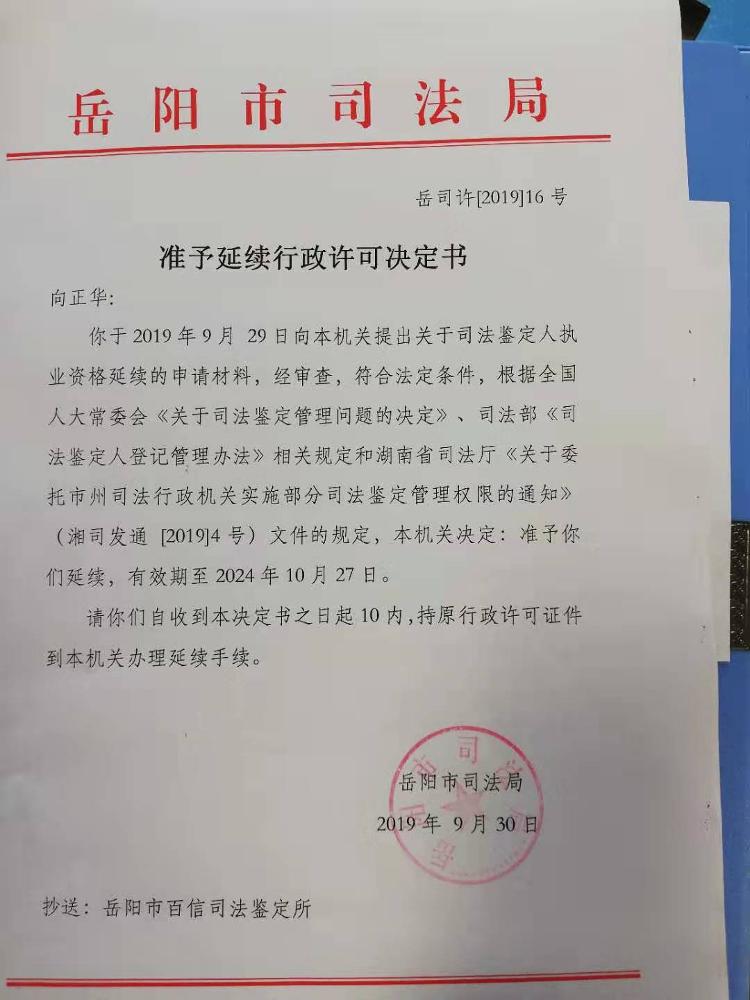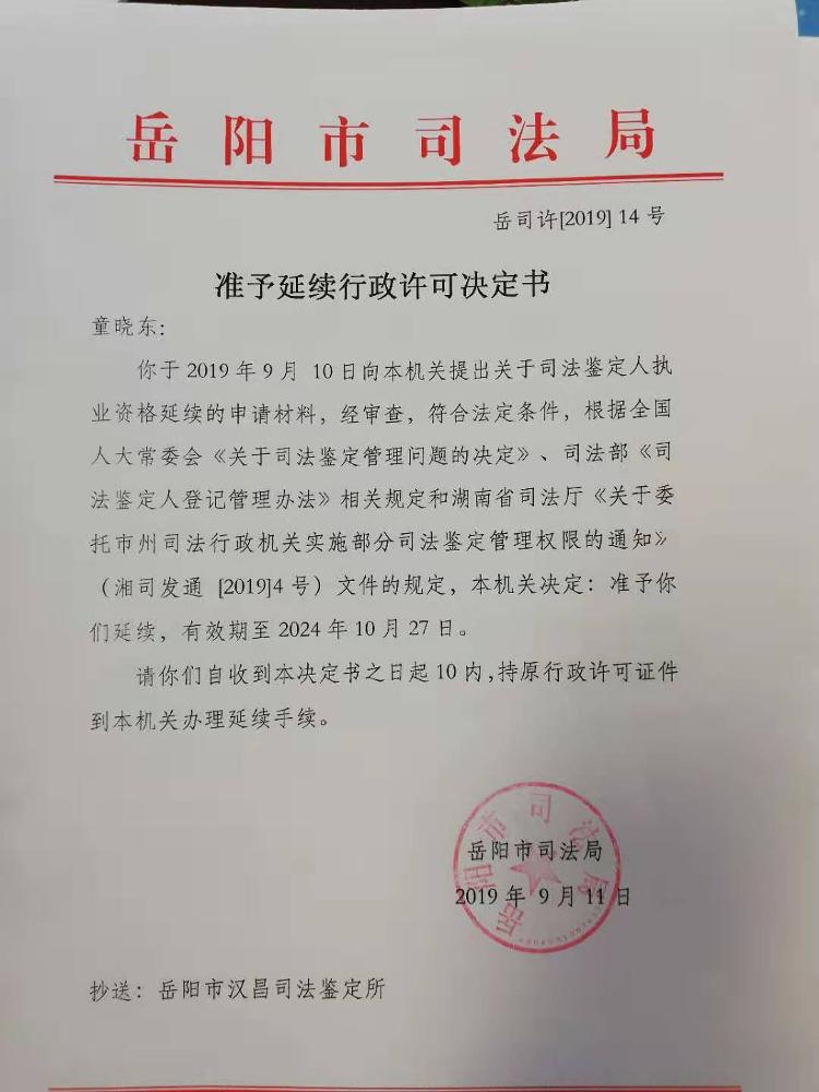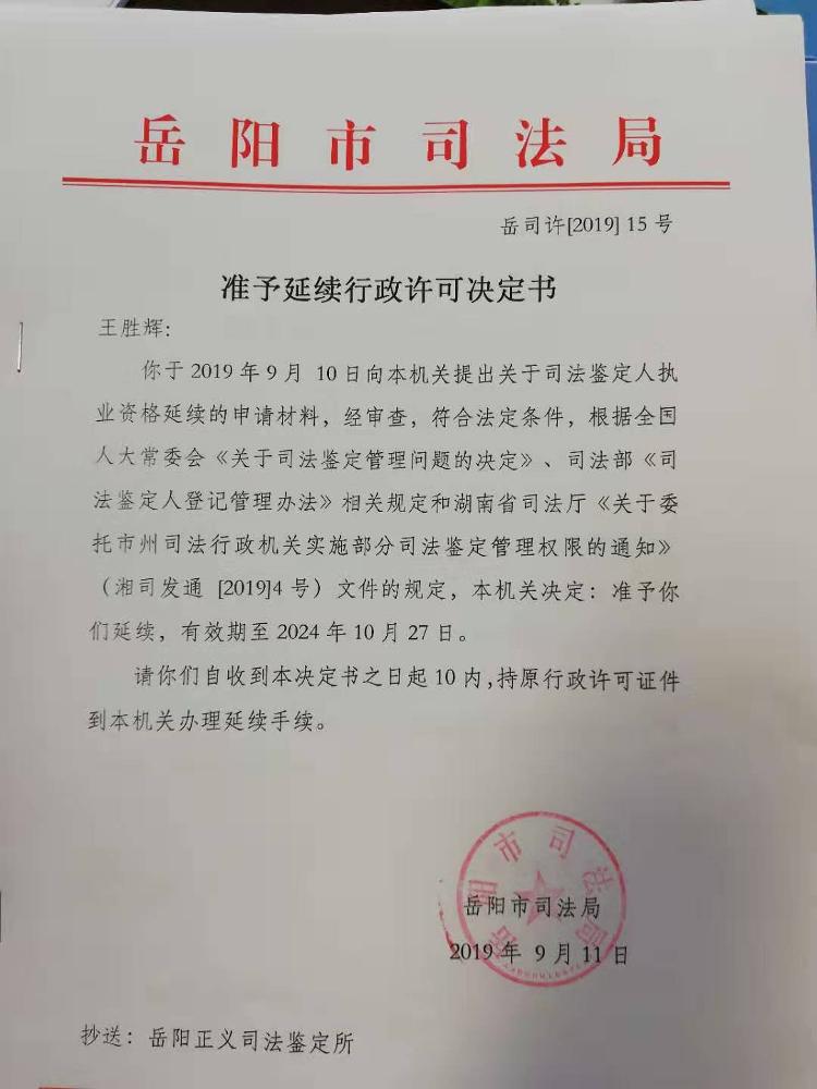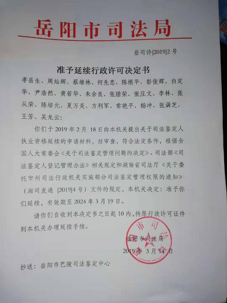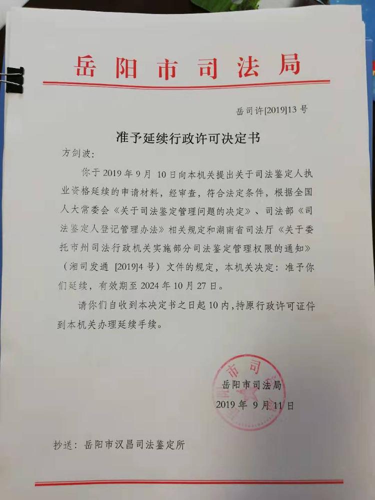准予方剑波等26人司法鉴定人资格延续申请行政许可决定书