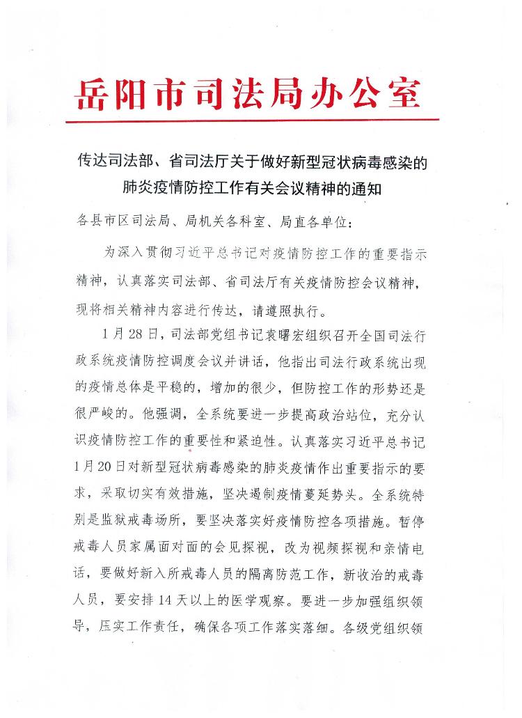 传达司法部、省司法厅关于做好新型冠状病毒感染的肺炎疫情防控工作有关会议精神的通知
