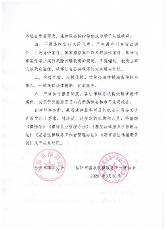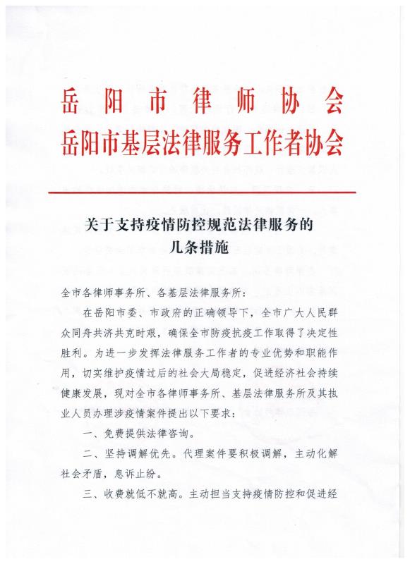 岳阳市律师协会 岳阳市基层法律服务工作者协会《关于支持疫情防控规范法律服务的几条措施》