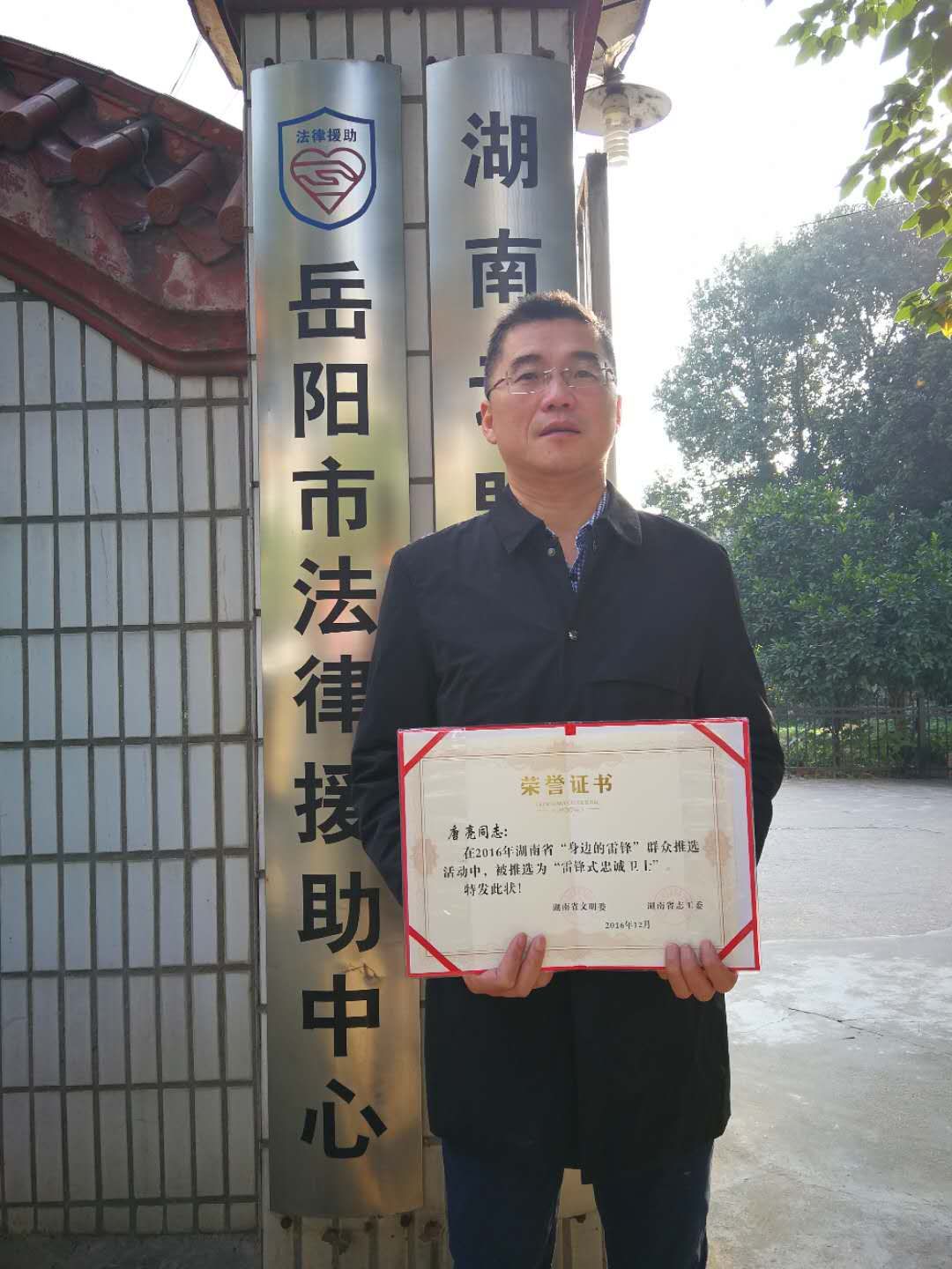 市法律援助中心主任唐亮荣获“湖南省雷锋式忠诚卫士”