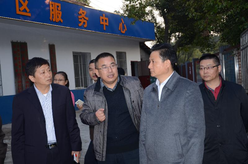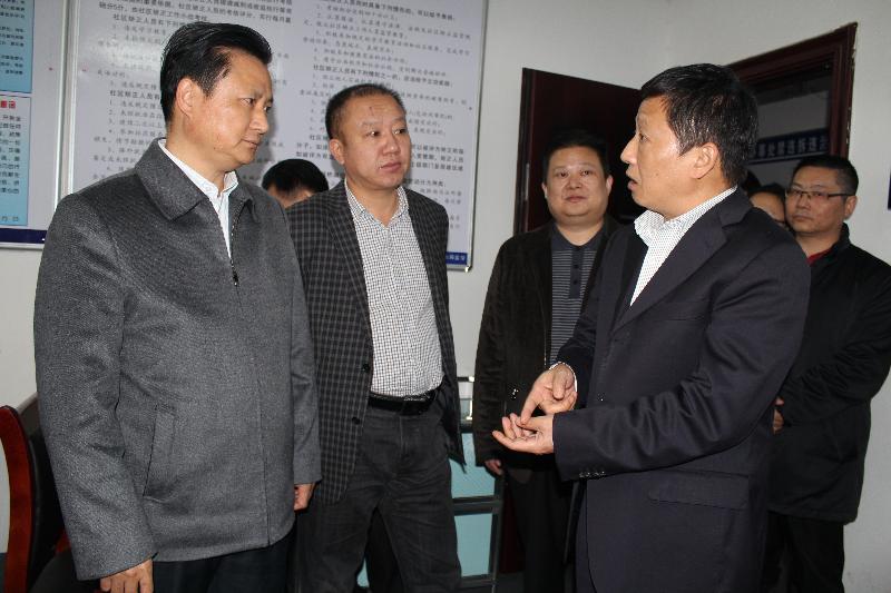 图为向伟雄书记(右二)在市司法局王湘涛局长(左一)陪同下在剪刀池社区戒毒指导站听取社区戒毒工作开展情况介绍