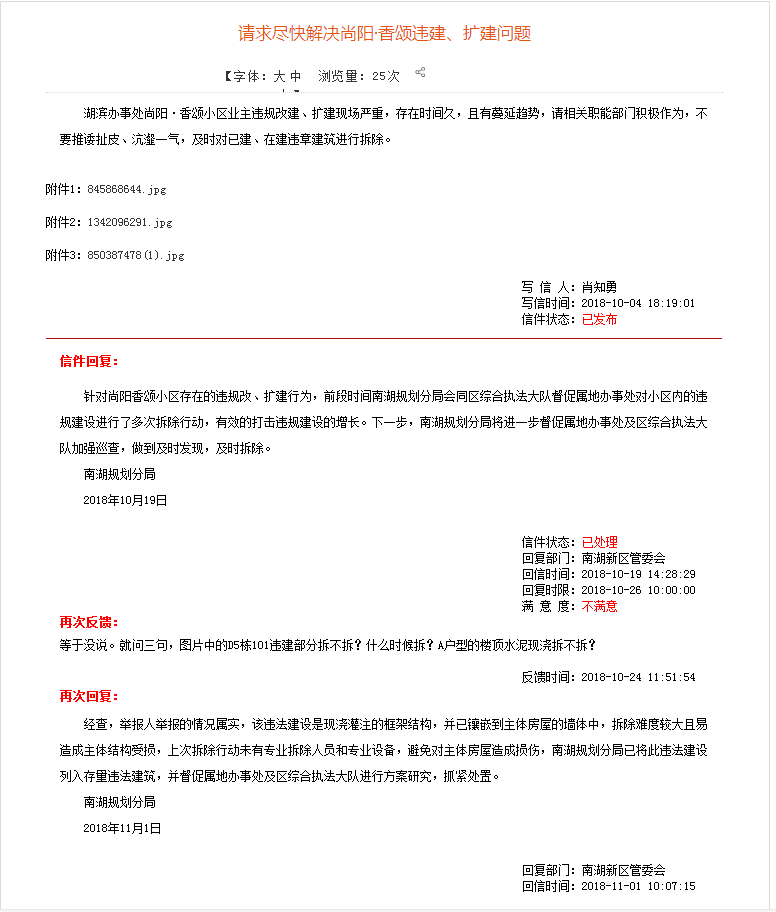 您好,我是南湖新区尚阳香颂小区业主,自2015年小区竣工来,先后有数十户业主违规改建、扩建,现场极其严重。南湖新区规划部门多次上门拍照取证,也偶加劝阻,但并没有多少让人信服的实际行为。近日,我就小区D户型一业主(附件1-4)和G户型(附件5)为例,分别向12345和市长信箱进行投诉,回复如下(附件6)。试问,在建的都拆不了,存量的未必拆得了?拆除行动未有专业拆除人员和专业设备,那养他们干啥?这是回复的理由吗?扮猪吃老虎?!