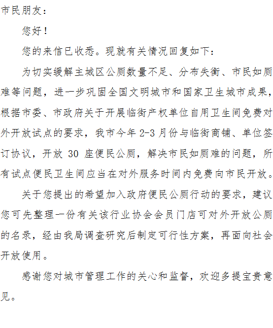 如果城管局打算继续扩展便民公厕,我们整个行业都希望能够共同为广大市民提供服务。