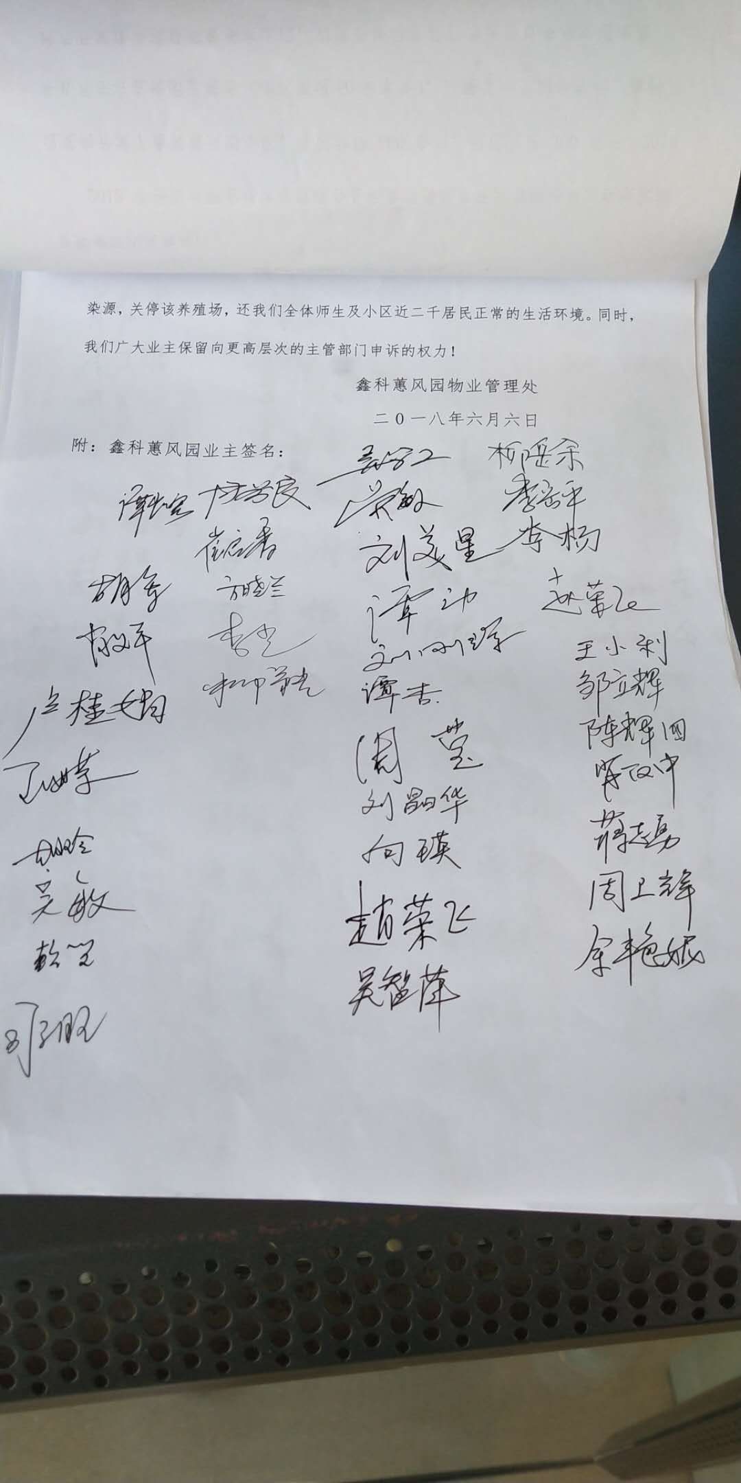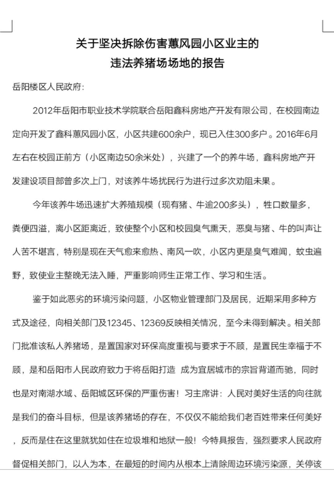 5、该养殖场的违法行为以对鑫科惠风园小区居民造成严重影响,有家不能回,有窗不能开的获得感已经深入人心,小区居民已经联名向楼区政府递交关停报告,若不及时处理,容易引发社会不稳定因素,甚至有激动业主提出向市监察委、省环保厅、省长信箱、国家环境生态环境部进行投诉,现恳请市环保局严格执法、执法必严、违法必究,给人民群众一片蓝天白云、青山绿水。党的十九大以来,环境问题一直受到党和国家重点关注,中央环保督查铁腕行动,为了让人民群众有更好的获得感,国家更推出让人民群众到政府办事只跑一次的改革理念,因此,恳请市府重视岳阳职院鑫科惠风园居民的心声。
