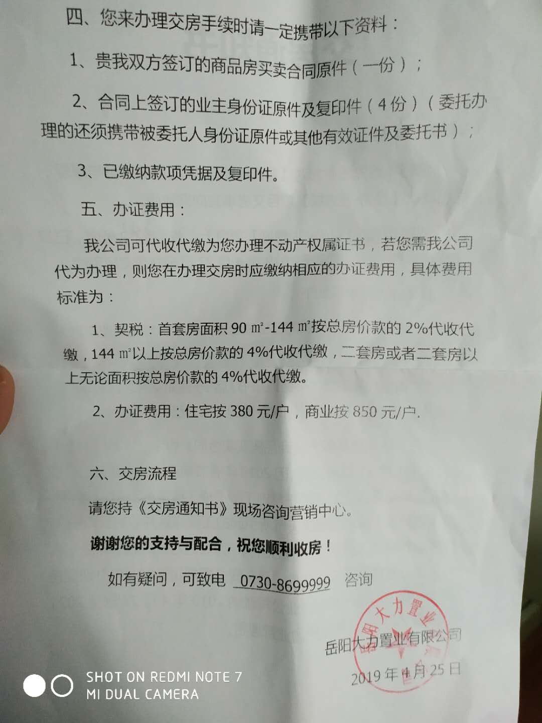 | 再次反馈: | 好的,谢谢市税务部门的及时且准确的回信,但为什么我购买的房子君尚理想城开发商岳阳大力置业有限公司致业主交房通知书上要求我们缴纳费用高于这个标准呢?附件有他们发过来的通知书,这个是什么情况呢? |