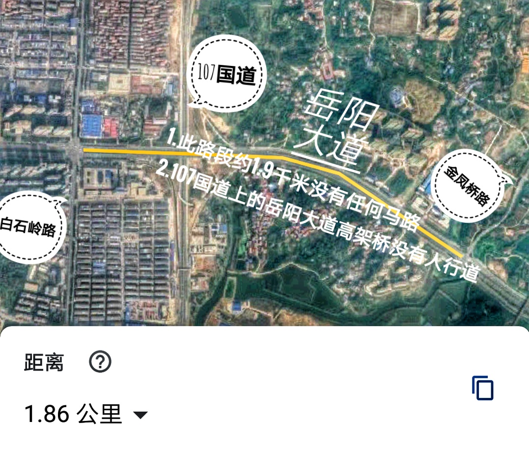 | 回复内容: | 您好,来信收悉,现就您反映的问题回复如下: 连接线1至9公里范围非人口密集区,岳阳大道的白石岭路口和南翔万商立交车辆都可以掉头和行人横过马路,岳阳大道作为城市快速车道必须保证通行效率,不能因附近零星出行更改道路规划设计。如更改道路规划设计,建议市民向规划设计部门反映。感谢您对公安交通管理工作的关心和支持。谢谢!