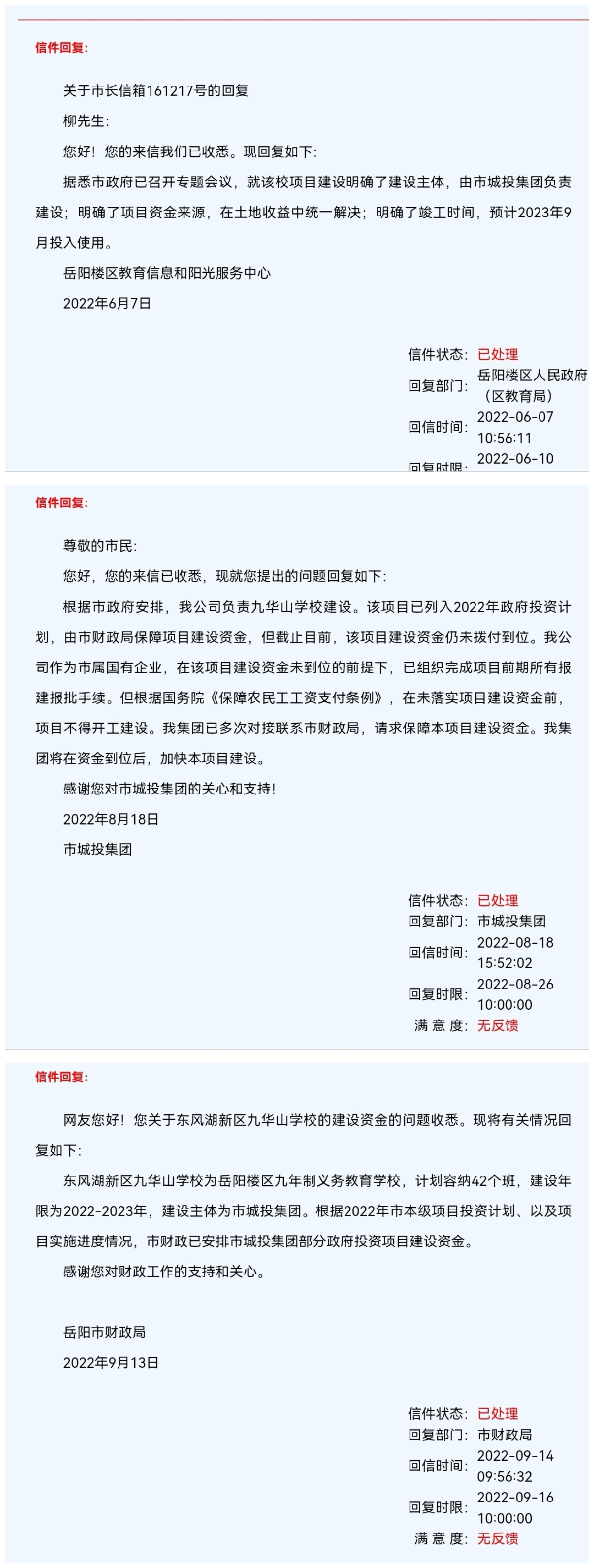 关于东风湖新区九华山学校的建设,楼区政府之前已有回复:明确了建设主体为市城投集团,明确了财政来源,明确了竣工时间为2023年9月,见附图。