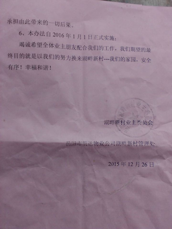 | 内容: | 尊敬各位领导您好,我是湖畔新村的一名住户,在2015年发布“关于加强管理外来车辆的停放的决定”,发布“决定”在物业处无法得知收费依据,所以特此向政府部门寻求答案。 1、“决定”上未注明具体钱数。在业主前往物业交钱时,询问具体收费标准依据,其工作人员一概不知。询问很多实际问题,物业工作人员也不能解决该问题。只收费,不回答。 2、“决定”上说明是通过小区业主委员会的商讨决定。但是其“决定”并不符合我小区具体情况,并不能实际解决小区停车难的问题。第一、小区实际车位并不够每户一个停车位。第二、小区每户并不只有一台车辆。第三、小区住户有亲人、亲属车辆临时停放并没有解决。 3、“决定”上把小区停车难得问题归结于外来车辆的问题,我觉得根本就不是根本原因。以此原因收费,太过牵强。 4、小区内幼儿园车辆临时卡,只需10元一张,有效期都是一学期。而本小区居民费用却高达310元(只有收据)。 5、本人觉得我身为该小区业主,在购房时就已经出了公摊费用,再停车不该另外收取管理费用,而物业收取该项费用后,也不能保证我们的车辆不受损害。而且每年我们也出了物业管理费。 6、收取费用,并没有注明该项费用对应的服务内容。业主缴纳费用也只是能够进入小区而已。而且该项费用也并没有进行公示。 综上所述,该项“决定”作为业主我既没参与,也没有得到应有的知情权,而物业只用沉默来代替,业主怕其车辆进不来,许多业主被迫支付该项费用。 另外听以前有车的业主说,以前也办理过两次该业务,但也并没有实行很久。 我希望相关领导可以核实并且帮我们解答疑问。谢谢! 附件1:uploadfiles/201602/20160201155250804.jpg |