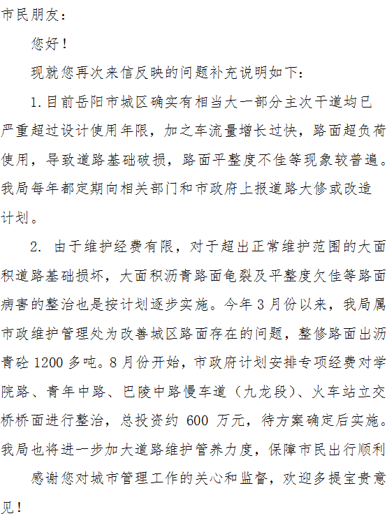 | 再次反馈: | 从回答的内容看,解释居多,整改措施空洞,对于城市道路出现的问题更多的缝缝补补、这样只会带来越来越多的补丁路,整个城市马路格局就像贴满了狗皮膏药,与岳阳的城市功能定位和品位格局及其不相符,对相关路面整修计划可否学习其他市州,对外进行公示,比如今年计划改造路面,改造的内容,改造的方式,改造的时间及预期效果等,将这些东西置于阳光下,接受广大百姓的监督和支持,让大家能对各项计划可期可盼。同时,对于部分破损十分严重、功能十分老化的道路,相关平台公司是否进行了接手,是否有具体的改造计划。期待城管局的一一解答,谢谢! |