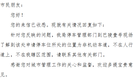 | 内容: | 尊敬的市长: 您们好,分别位于岳阳楼区巴陵东路明星央城、巴陵壹号两个小区于2014年陆续业主入住,小区停车位明显不够用。巴陵壹号小区一楼就是华日汽车城、洛王社区办事处,明星央城一楼有银行、公积金管理局等公益性商务机构。随着岳阳的经济快速发展,华日汽车城商户的生意和往来的外部顾客也是越来越多,导致明星央城、巴陵壹号业主停车难问题日益严重。小区现有的停车位已满足不了小区车辆的停放,特向贵局申请停车位。 目前两小区设置地下停车位不足业主使用,尤其是业主夜间车辆停放难尤为突出。故向贵局申请在巴陵东路靠明星央城、巴陵壹号小区一侧路上申请40个公共停车位,希望贵市领导给予解决为盼。 此致! |
